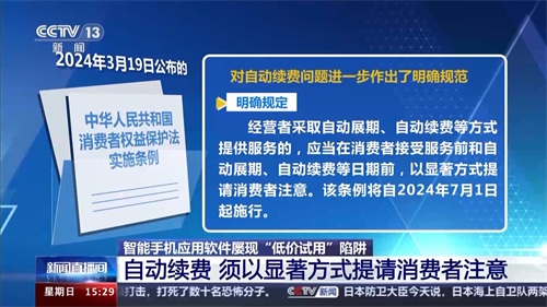 近期,对于备受诟病的自动续费问题,相关部门进一步出台了规范措施,今年3月19日公布的《中华人民共和国消费者权益保护法实施条例》对自动续费问题进一步作出了明确规范。条例明确规定,经营者采取自动展期、自动续费等方式提供服务的,应当在消费者接受服务前和自动展期、自动续费等日期前,以显著方式提请消费者注意。该条例将自2024年7月1日起施行。(来源:央视新闻)