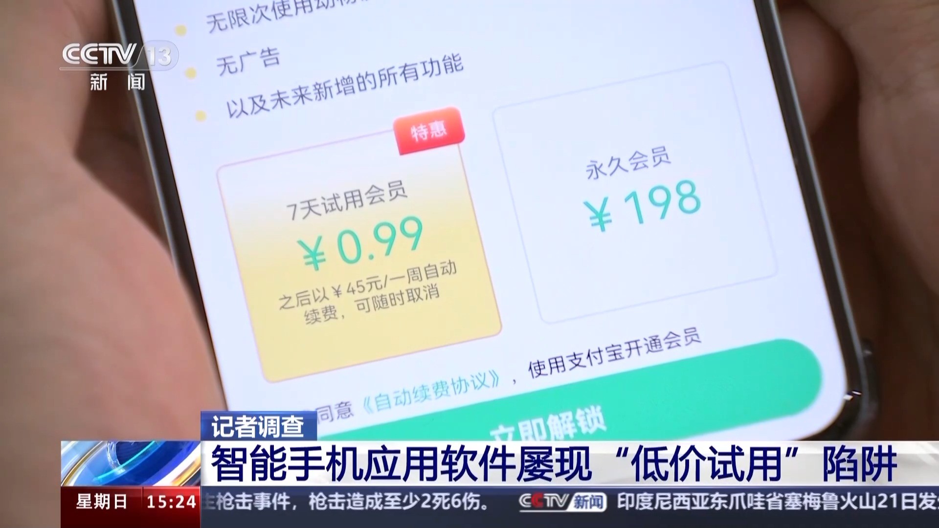 如今智能手机已经成为人们生活中不可或缺的工具,而手机里琳琅满目的App应用软件也成为智能手机的重要组成部分。然而,某些商家为了逐利,打出了“7天免费试用”“1元享7天”等广告来招揽用户。殊不知,这些有可能是商家设置的陷阱。有的点击“免费试用”后即默认开启包月包年套餐;有的“低价试用”宣称低价续费,结果续的是高价套餐。