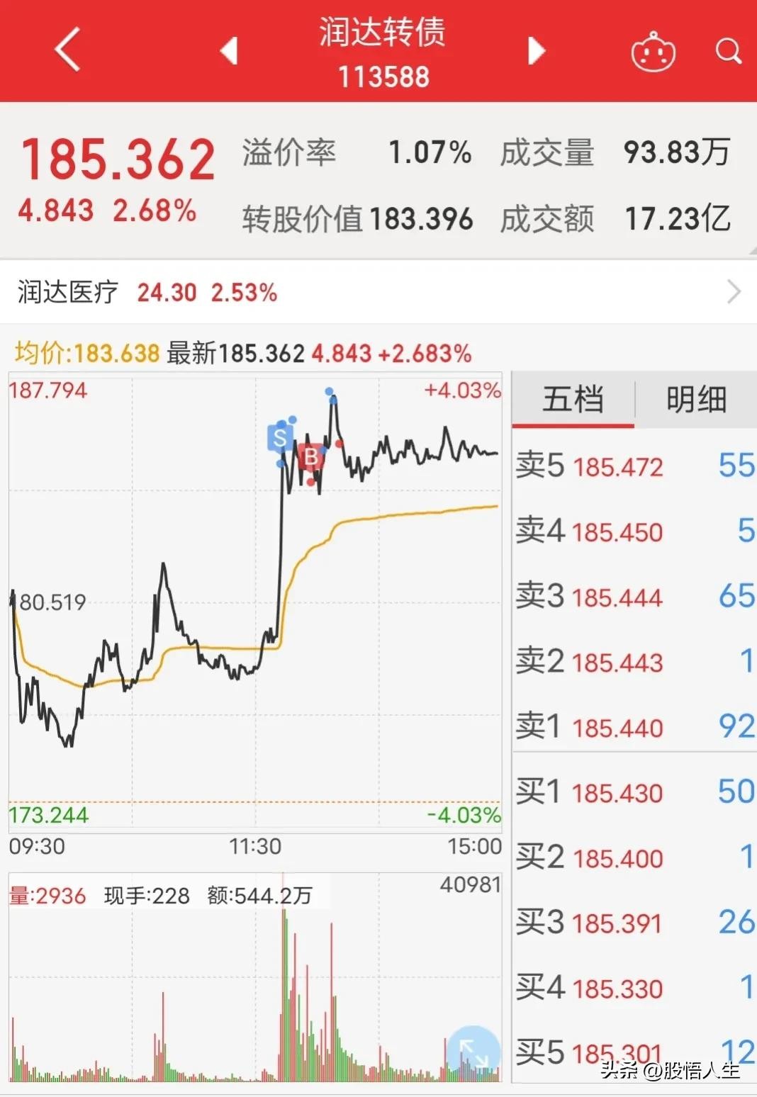 下午一开盘润达就启动了,和操作东湖一样,我仍然没有着急卖出。1点13分时,润达直线拉升至185远价位之上,彼时果断连卖两次。