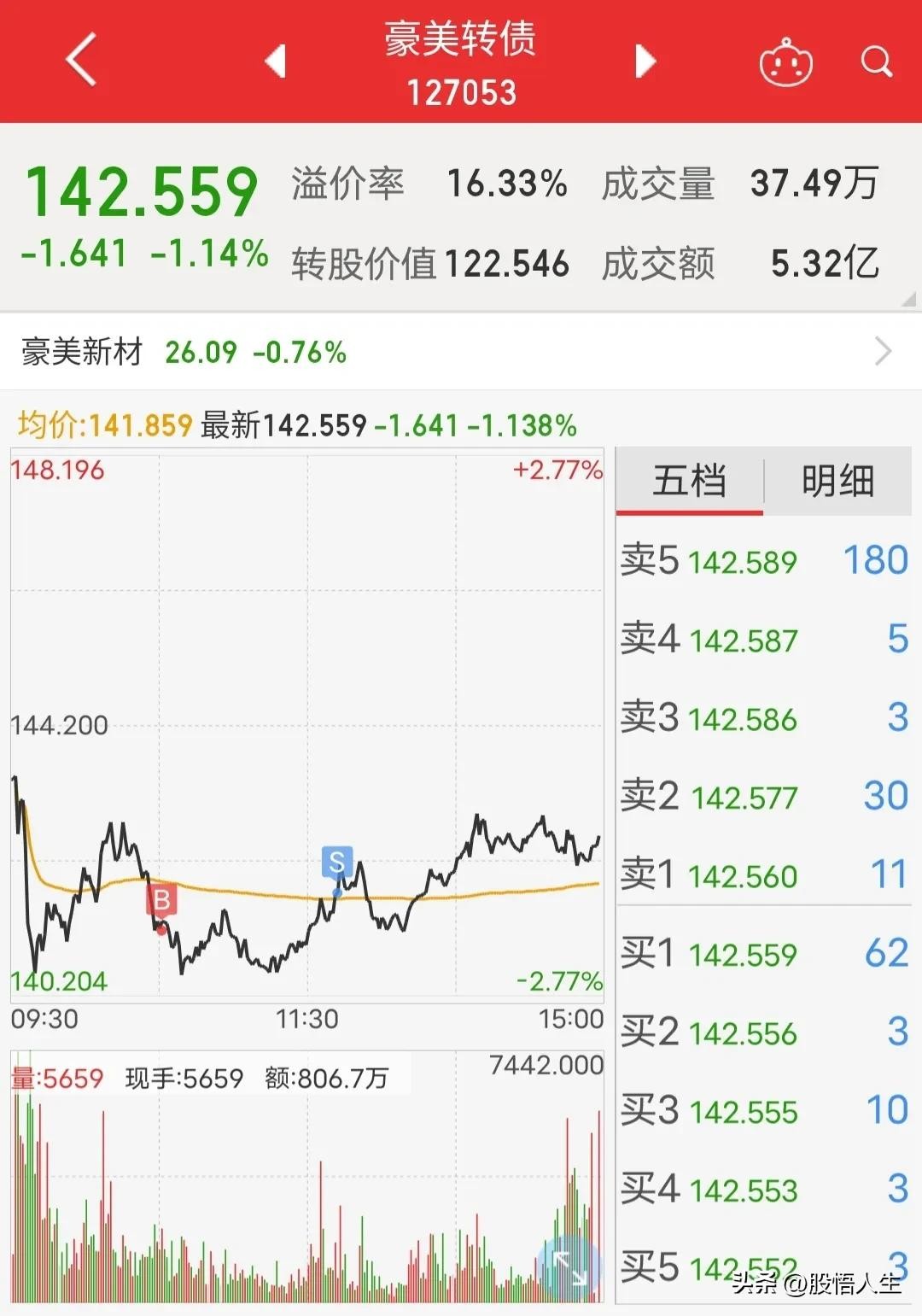 下午开盘后,豪美终于上返,十二分钟后,一见到了均价之上,便不敢再拿,这货后来曾到143元之上。