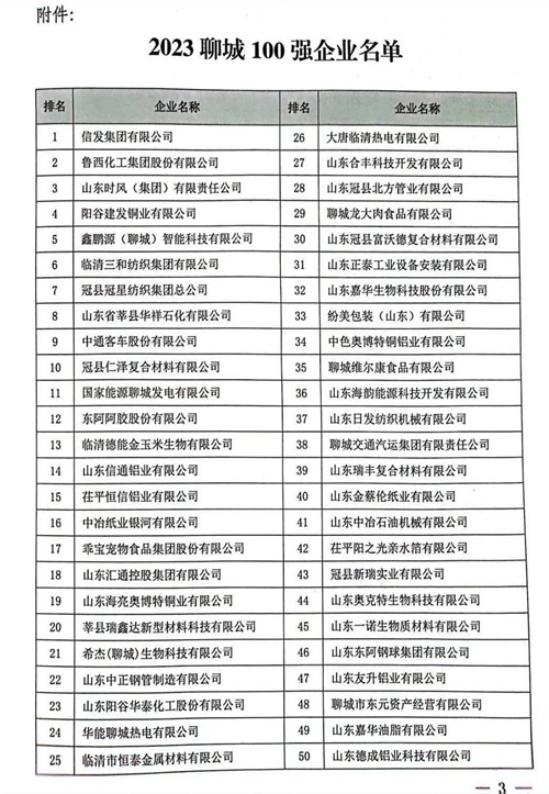 2023年聊城聊市工业和信息化局、聊城市企业联合会、聊城市企业家协会共同公布了2023聊城百强企业名单。