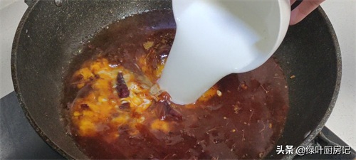 4,最关键的一步到了,先用漏勺把锅中的大料渣捞出,然后再加入一碗纯牛奶,这样能使汤汁变得更有营养。