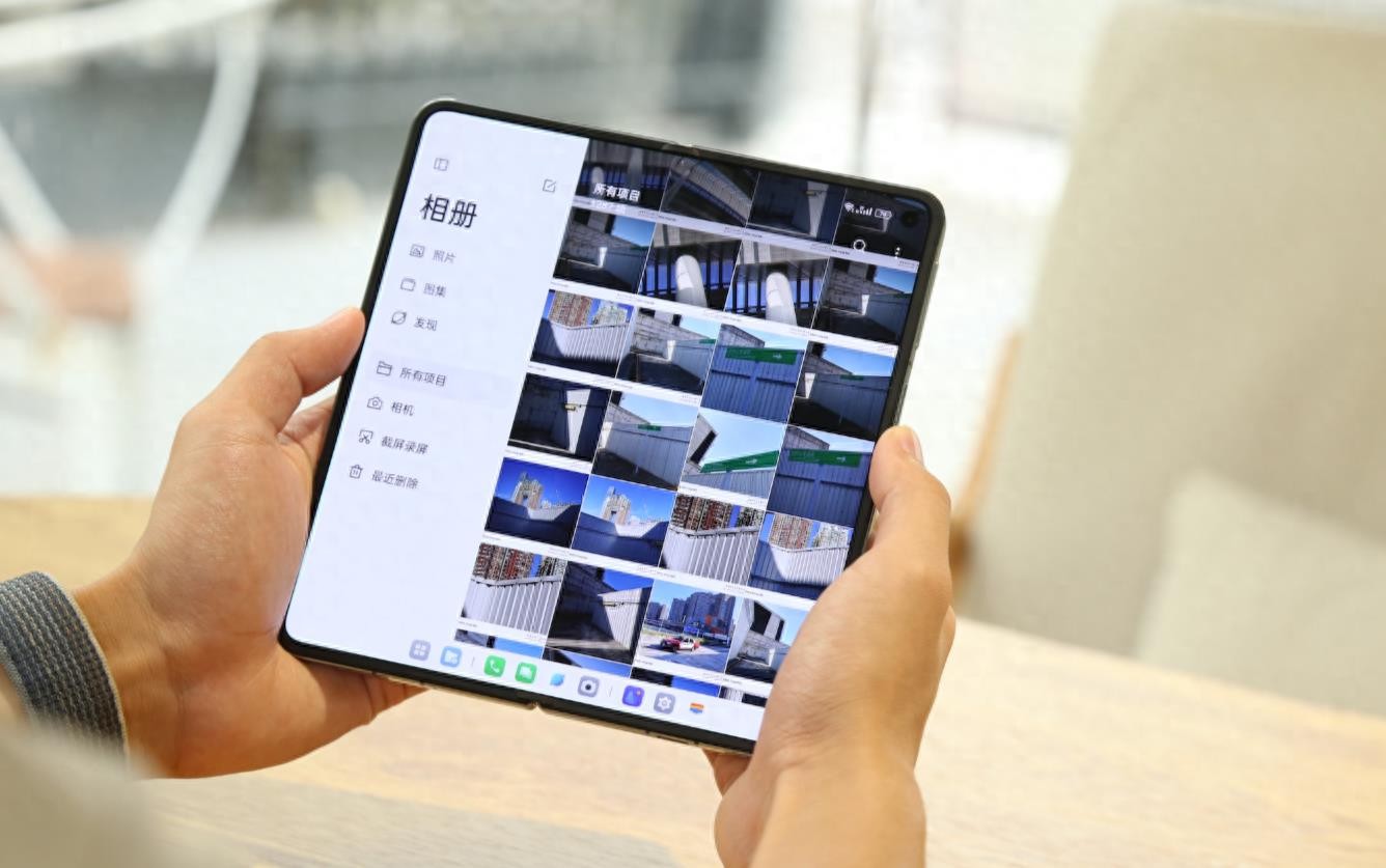 针对单一应用在大屏上的使用适配,OPPO Find N3也交出了行业首屈一指的答卷,实现了TOP 3000应用85%的适配,为用户提供了更好的折叠屏应用体验。更重要的是,OPPO Find N3还几乎将手机的原生应用进行了全面的大屏重塑,重点调节了应用的层级关系,将以往需要两步的操作层级放在一个画面上。比如相册应用左边是照片、图集等不同的功能Tab,右边则是照片的年月日详细视图。