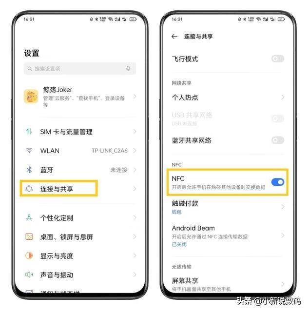 2. 打开开关的方式有两种,第一种是进入设置后,找到「连接与共享」,点击进入后,可以看见有一个NFC开关,打开开关,即可以使用NFC功能。第二种打开NFC开关的方法就是下拉通知栏找到NFC开关按钮,点击即可打开。