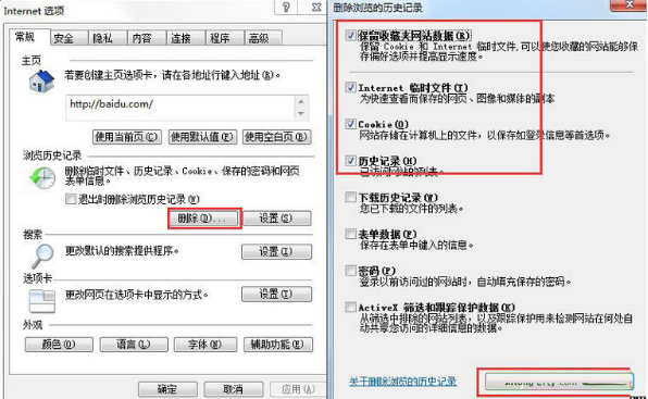 3、加载禁用完成后,点击齿轮图标,选择internet选项,打开后清除历史浏览记录,包括临时文件,cookie,如下图所示: