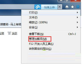 1、打开ie浏览器,然后点击右上角齿轮图标,在下拉菜单中选择“管理加载项”,如下图所示: