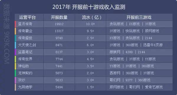 2017年页游开服前十游戏收入监测,《蓝月传奇(贪玩蓝月)》年度收入超10亿,远远超过其他产品。