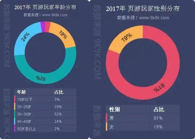 据2017年的一项统计结果显示,页游玩家的年龄分布30-39岁占比52%,其次是40-49岁玩家,且81%为男性。