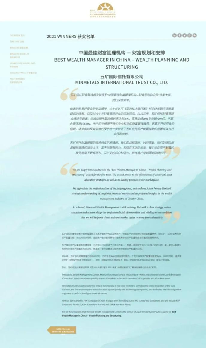 中国财富奖是由享誉亚太私人银行与财富管理领域的权威媒体《亚洲私人银行家》(Asian Private Banker)颁布的,其评选以专业、严格著称,关注并表彰那些引领行业变革的优秀财富机构,这是其首次将财富管理荣誉颁发给信托机构。这也是五矿信托财富管理继《亚洲货币》《亚洲银行家》《财资》之后,再次斩获的国际权威荣誉。五矿信托财富管理赢得权威荣誉大满贯,进一步验证了五矿信托资产配置战略的显著成效与行业领跑优势。