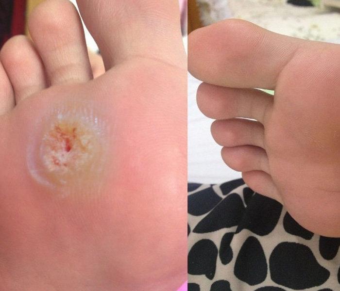 鸡眼好发于足部,也可见于手,大约有豌豆大小,表面呈灰黄色或腊黄色,略高于皮肤表面,皮损部位质地坚硬,境界明了,其尖端深入皮层并可抵压真皮乳头层神经末梢,所以当发生挤压的时候可产生剧烈的疼痛。