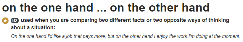 这个短语一般被翻译成“一方面,另一方面…”中文里有叙述两方面事件的意思,这两方面并不矛盾冲突,甚至关联不大。然而在英文中,它表达的是两个不同因素或相反角度。在这里提醒大家要注意了,以后不要把该短语当成简单罗列或并列的表达了。