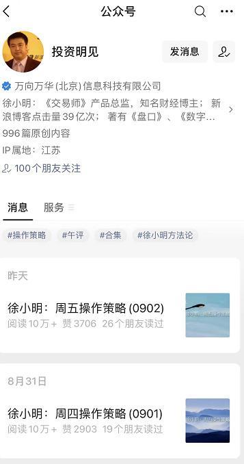 2017年,“徐小明”开通微信公众号“小明直播间”,今年2月改名为“投资明见”。每天发布的操作策略,阅读量均在10W+。