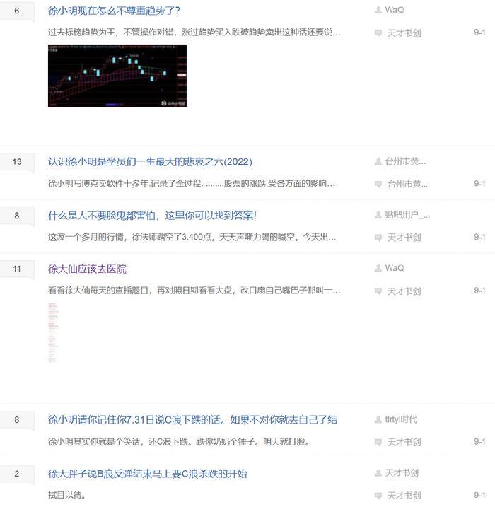 据称,当时他在新浪做开盘播报的节目,新浪的崔编辑找到他,请他过来开博客。结果无心插柳柳成荫,最终成了名博。“徐小明”对于自己成功总结了几点:一是同步分析,刷新频率高,保持热度;二是文章客观,技术分析;三是具有指导性。“没有马云的时代,只有时代的马云”。“徐小明”能够爆红,还有几点是他在访谈中没有谈及的,也是时代所造就的。一、2007年的大牛市,股民数量激增,股民对于财经博客的访问量大增;2008年的大熊市,股民亏损严重,急需心理按摩,期望大V指条明路。二、徐小明技术分析只预测大盘不推荐个股,规避风险的同时,会让数据准确性一定提升,粉丝高度信仰,流失少。三、看娱乐博主的号只能吃瓜,但看财经博主,特别是股票博主的号则可以“搞钱”。谁不想赚钱呢?“徐小明”预测的准确性如何?司机没有长期跟踪无法评价。司机看到百度贴吧有一个“徐小明吧”,几乎全是骂他的。不过,一个财经博主有一个专门的百度贴吧,也足以见其影响力之大。