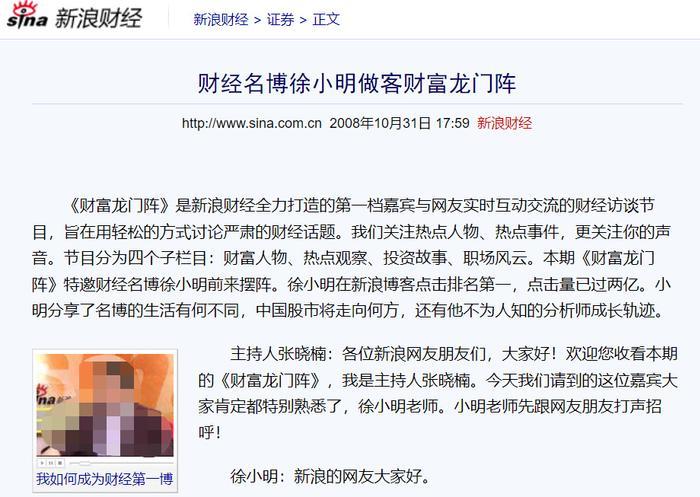 在微信公众号的介绍上,“徐小明”是《交易师》产品总监,知名财经博主;新浪博客点击量39亿次;著有《盘口》、《数字化定量分析》、《十年》;和讯投资学院、新浪投资学院的广 大投资者广泛好评。草根出身的“徐小明”,是如何一步步成为财经顶流?今天,司机为你复盘“徐小明”的成长历程,以及背后的故事。2008年,“徐小明”接受新浪财经一档访谈节目时谈到了自己是如何开始写博客的。