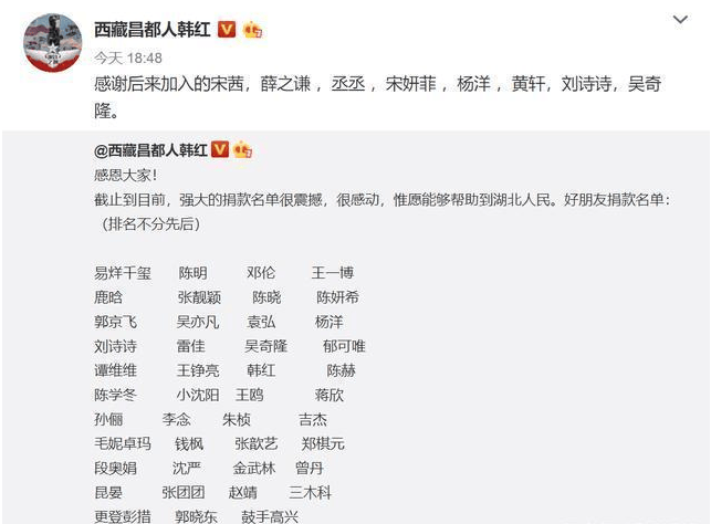 易烊千玺是第一批通过韩红爱心慈善基金会捐款的明星,韩红发布的名单,尽管强调排名不分先后,但易烊千玺排在第一位,证明他是最早捐款的。