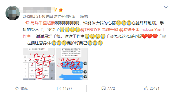 私信内容统一为:“您好,看到您发的微博了,谢谢您对千玺的支持和喜欢,更谢谢您的勇敢和无私。方便的话,您可以把姓名、手机号、常居城市发给我们,我们会为您预留一张演唱会门票,待今年时间、地点都确定下来后,会提前跟您联系。如果您有时间,咱们演唱会现场见。希望千玺的这份心意,可以给您带去温暖和力量。祝您健康平安,请一定要保护好自己,我们等您平安归来。”