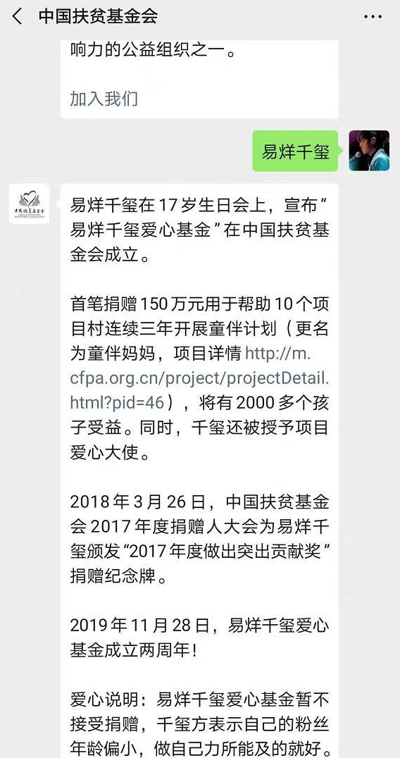 如果在中国扶贫基金会官方公号上搜索关键词易烊千玺,就会推送“易烊千玺爱心基金”的相关介绍。原来这个基金会是在易烊千玺17岁生日会上成立的,首笔捐赠150万用于帮助10个项目村连续三年开展童伴计划(后更名为童伴妈妈),将有2000多个孩子受益。到去年11月28日,该基金会成立两周年。