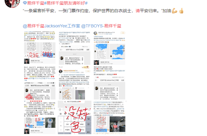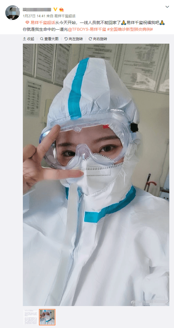 另一位粉丝,有网友透露是奋战在一线雷神山医院的医务人员, 1月27日,她发文并艾特易烊千玺写道:“从今天开始,一线人员就不能回家了,易烊千玺祝福我吧,你就是我生命中的一道光”并配了两张图,第一张是医院下发的通知,宣布从即日起,一线工作人员24小时工作在一线,直到疫情结束。第二章是自己穿着防护服、戴着护目镜的自拍。