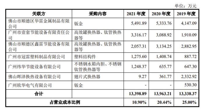 在前次闯关科创板的过程中,芬尼科技就因关联交易问题受到监管问询。从本次披露数据来看,报告期内,公司自关联方的经常性关联采购金额分别为1.33亿元、1.4亿元和1.34亿元,占当期营业成本比例分别为25%、20.44%和10.9%,采购的原材料主要是金属换热器、水箱内胆、钣金件和塑料结构件等。