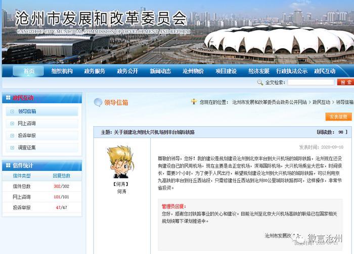 网友提问:尊敬的领导,您好!我的建议是规划建设沧州到北京丰台到大兴机场的城际铁路,沧州现在还没有建设自己的民用机场,现在主要是去正定机场,滨海国际机场,大兴机场乘坐大巴车,时间很长,需要3个小时,为了便于人民出行,希望规划建设沧州到大兴机场的城际铁路,可以利用京九高铁的丰台到任丘西站段,只需修建任丘西站到沧州80公里城际铁路即可,这样操作,非常节省投资。