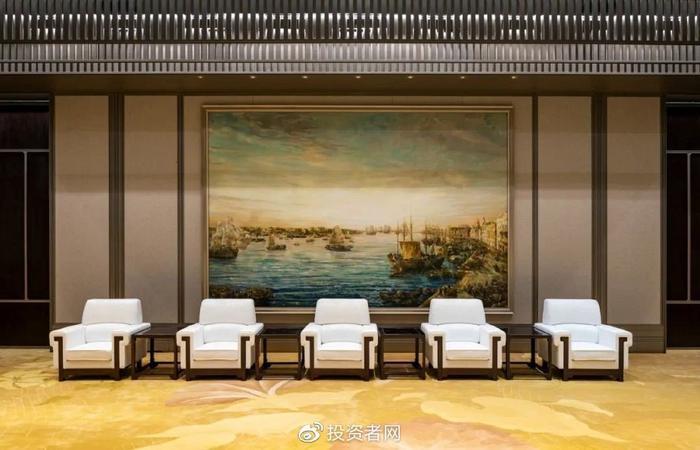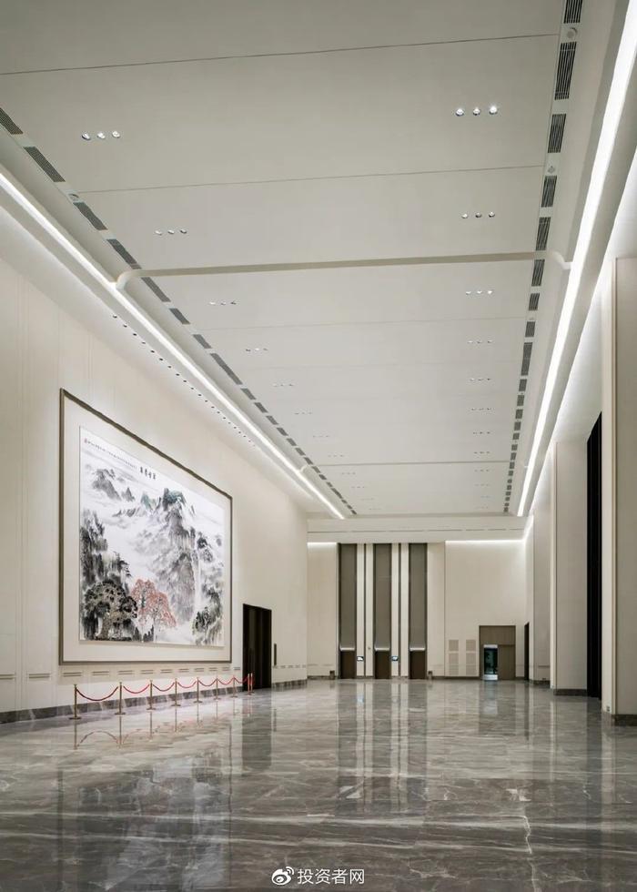 东前厅引用岭南元素打造出庄重与序列感,墙面选取“翠峰春泉”为主题的画作,营造出现代化会议空间,同时体现广阔的精神气魄。