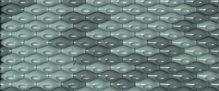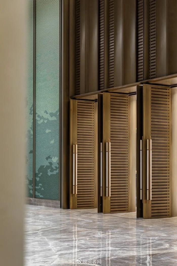 缓步进入一层迎宾大厅,气势磅礴震撼!大开间通透至底,青瓷材质点缀的主墙一片青绿色,走近发现是由4组颜色相近却深浅不一的瓷片,通过序列排布,塑造每个瓷片单体均为流线造型,增添跃然眼前的流动感。