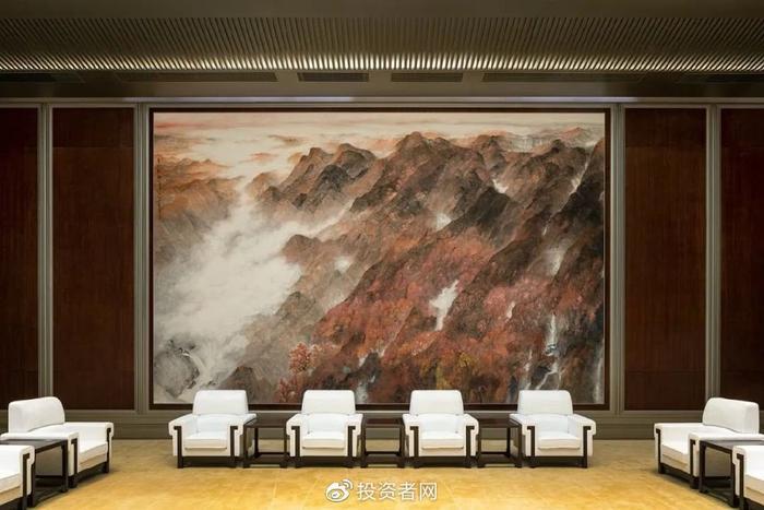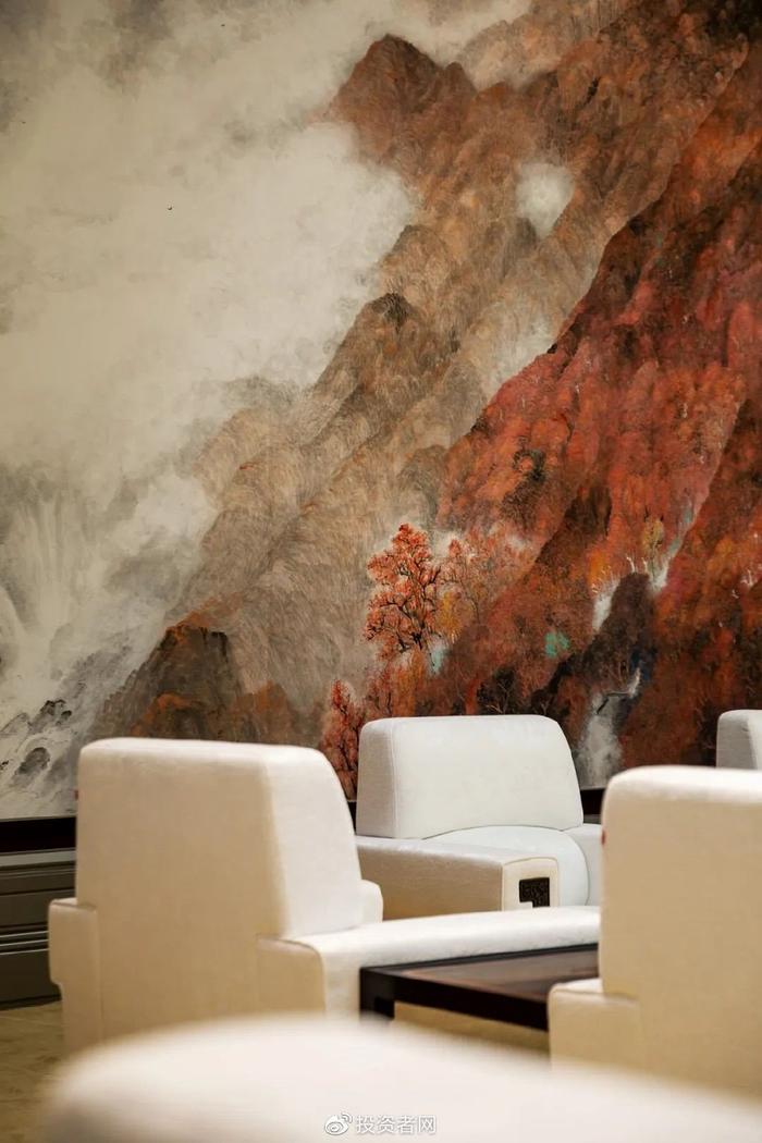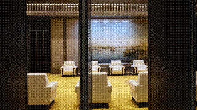 当宾客从两侧引入合影厅,一幅巨幅艺术品“绿水青山”映入眼帘。四周竖向造型的墙面给人稳固之感,又有列队欢迎之势,迎纳“群贤归至”。