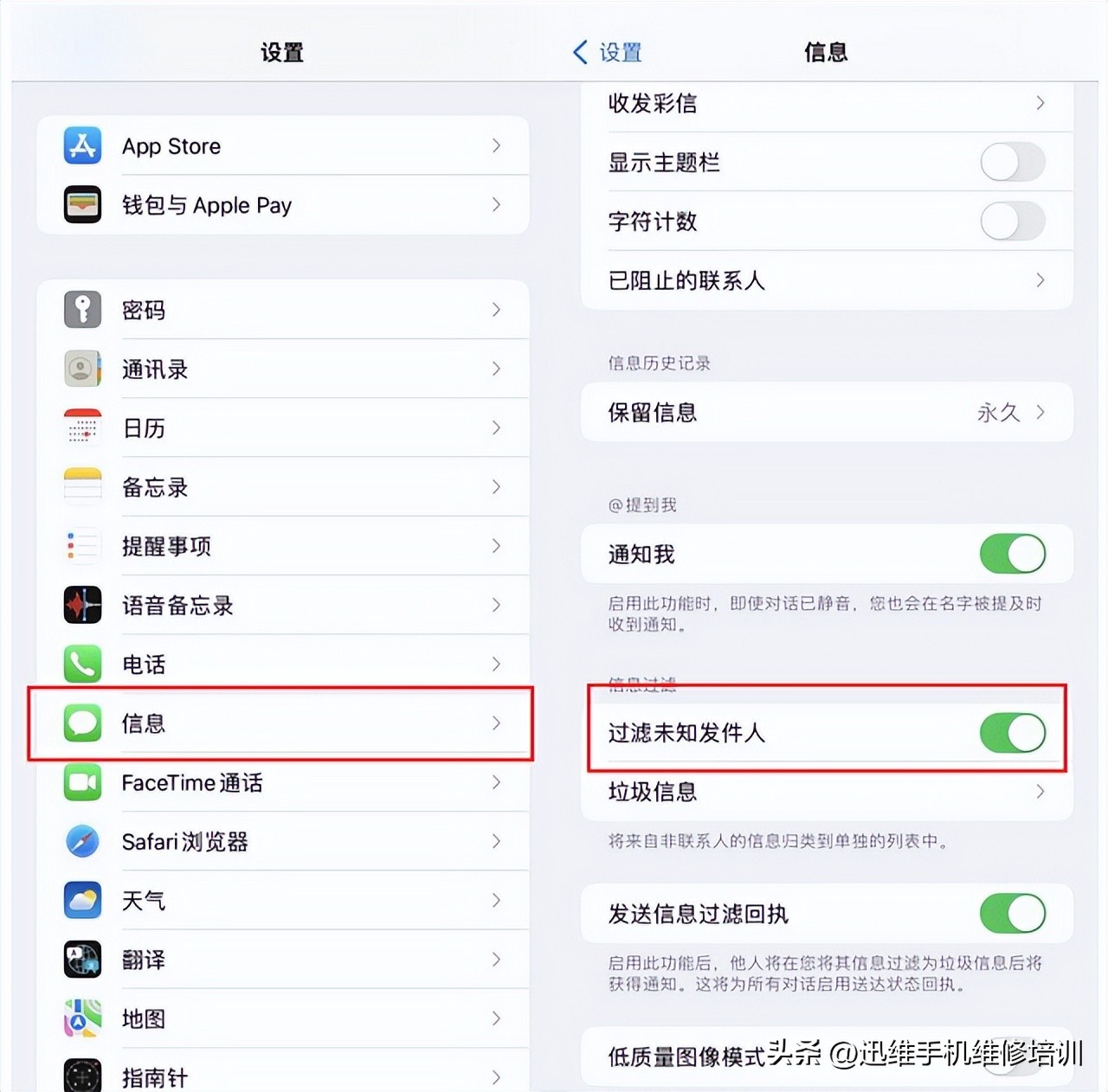 也可以点击“设置”进入“信息”界面,然后开启“过滤未知发件人”功能,这样就不会收到通讯录之外的垃圾短信了。