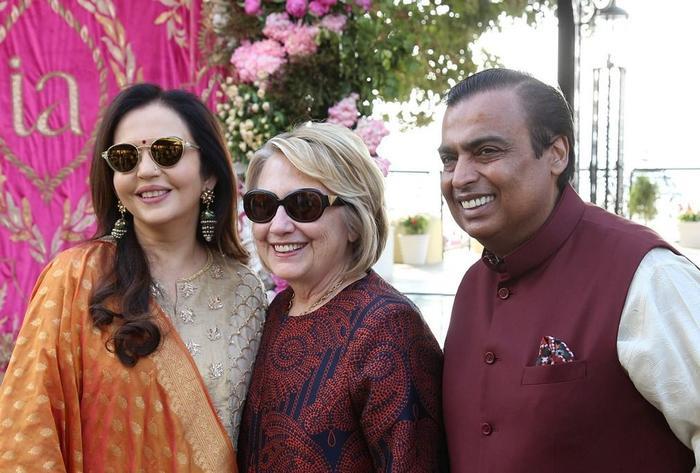 据悉,2018年7月印度首富、信实工业主席穆克什·安巴尼(右一)取代阿里巴巴创始人马云,登顶亚洲首富。图为穆克什·安巴尼与美国前任国务卿希拉里·克林顿(中)及其夫人Nita Amban(左一)