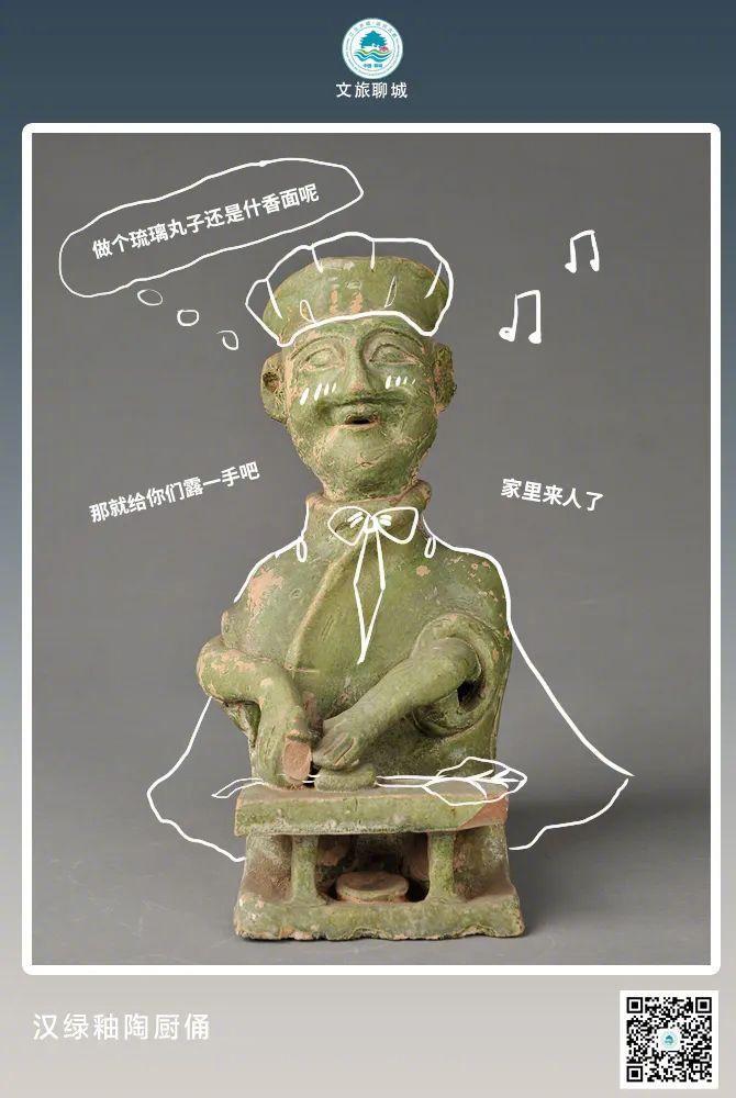 看这挽着袖子切菜的娴熟姿势,必然是厨师没错了,加上一抹自信的微笑,仿佛在说“人是铁饭是钢,吃饱了才有力气思考。想吃啥?都能给你做!”该俑在高唐城东固河出土,它表面所施绿釉为低温铅釉,是以铜为主要着色剂,以铅的化合物为助溶剂,在700摄氏度左右的火焰中烧成,从而呈现出翠绿色。以陶俑来代替人殉葬的风气秦汉时期盛行,相当人性化,汉代重视厚葬,从随葬品可看出汉代日常生活状态,这位陶厨俑一身青绿,在一众陶器里很是亮眼。