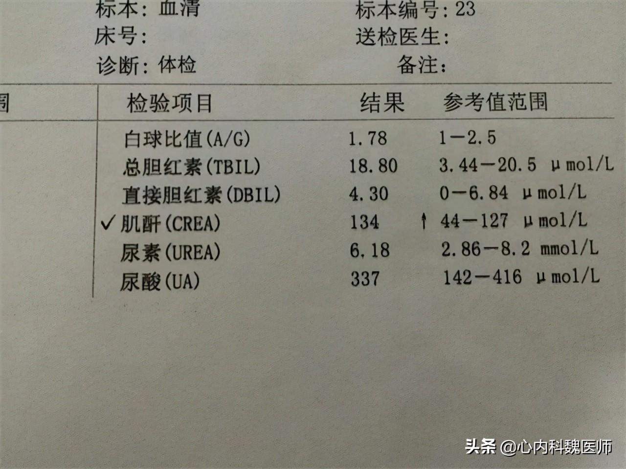王先生,47岁,4月初体检发现肌酐偏高,当时肌酐109(正常范围44~105),尿酸370,其他的尿常规,B超检查都正常,个人建议动态观察。