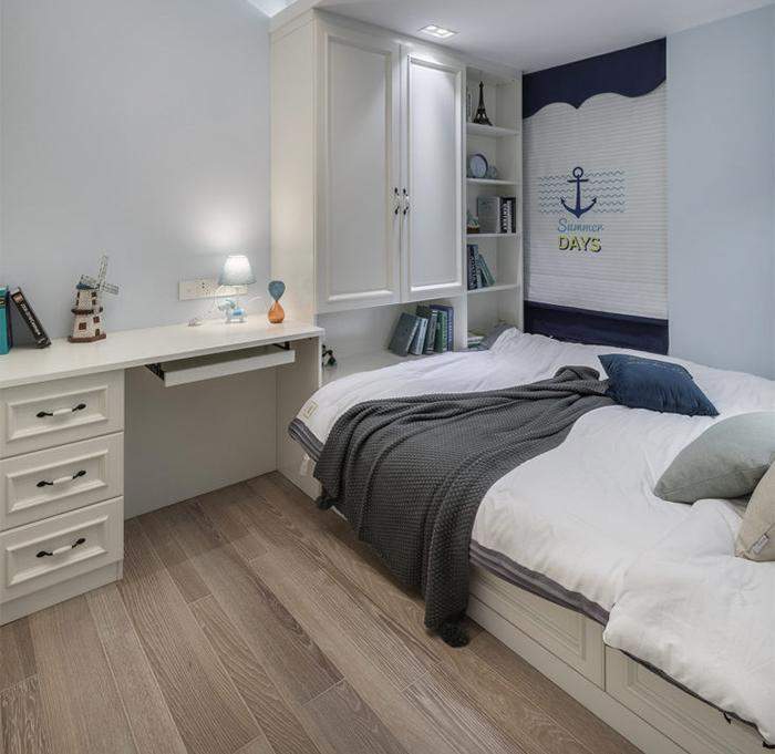 另外还有很多人喜欢给儿童房定制一张榻榻米床,主要是为了把空间利用最大化,把书桌和衣柜都连接起来。