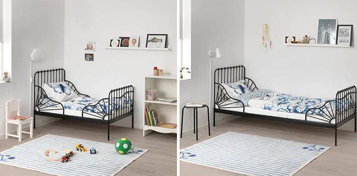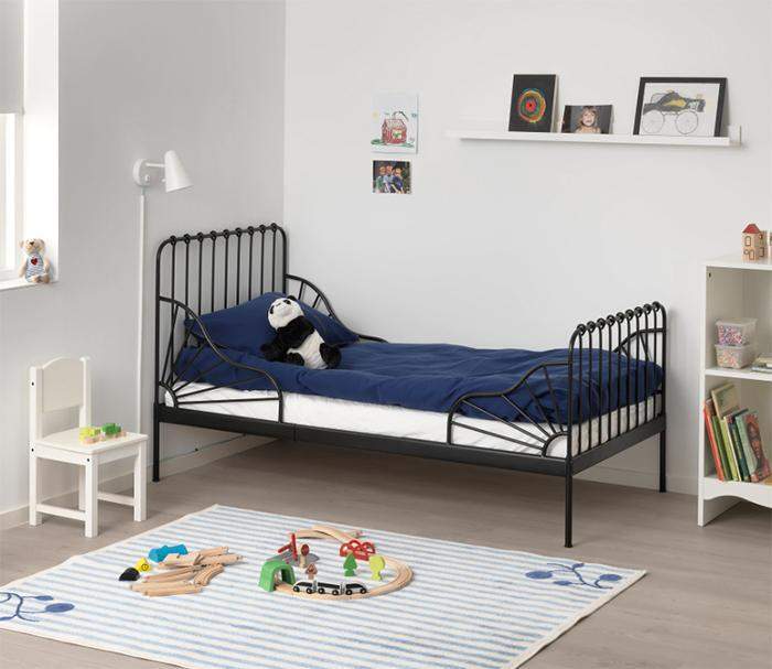 宜家家居有多款儿童床可以选,其中有一款铁艺床可以伸缩,加长床能够陪伴孩子一同成长,比较受欢迎。