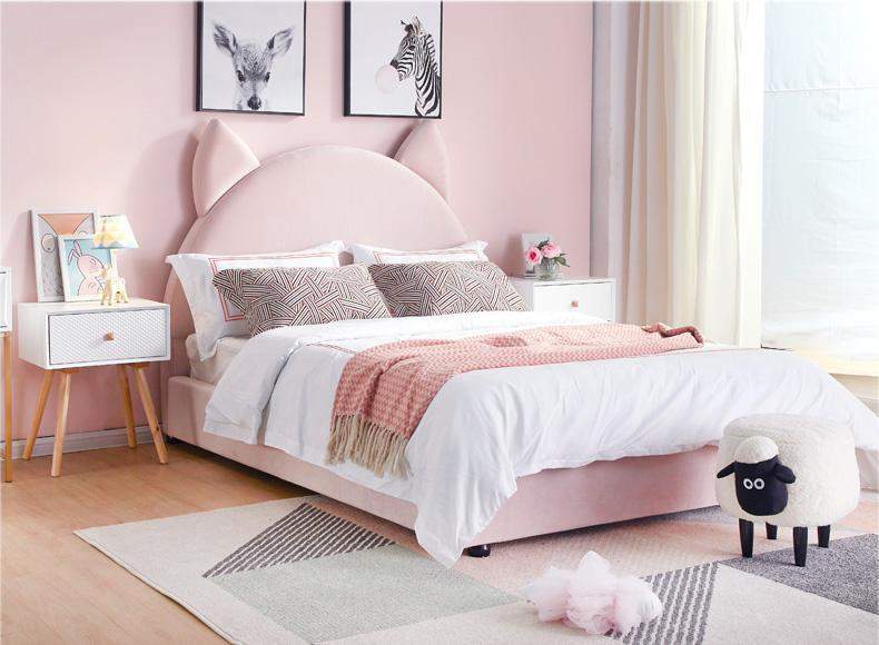 布艺床:布艺床一般是实木框架打底,表面布艺包起来,看起来比较柔软,很多女孩都很喜欢粉色的布艺床,不过布艺床的缺点是不耐脏,表面脏了清洗比较麻烦。