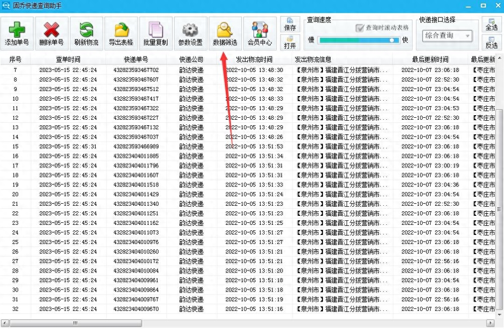 软件还有“数据筛查”的功能,这可以帮助我们在软件中直接筛查查询结果,精准定位我们要查看的快递信息。