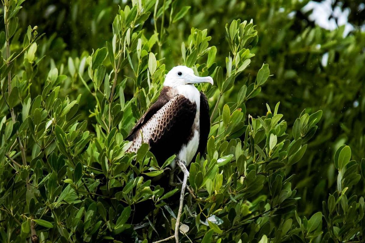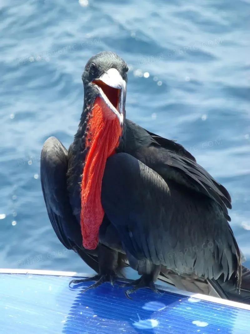 军舰鸟是一种大型海鸟,体长在1米左右,双翼展开时最长可达三米。雄鸟拥有鲜红色的喉囊,在求偶时会充气膨大,十分显眼。