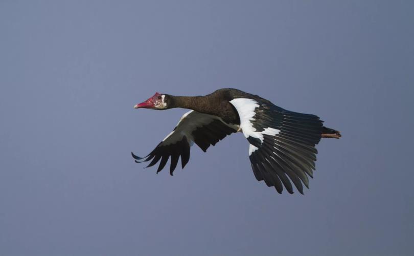 巨翅雁是生活在撒哈拉沙漠以南湿地地区的一种鸟类。它们以素食为主,平常就吃植物的种子、果实和芦苇等不会运动的东西。所以巨翅雁的身体肥大,体长接近1米,体重足有6-7千克,最大个体达到过17千克。