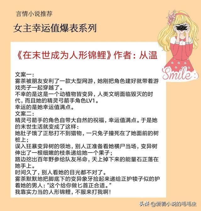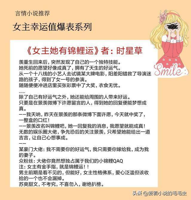 大家好,我是毛毛虫,今天给大家推荐5本女主幸运值爆表的小说,福运逆天全家宠,出嫁老公接着宠!(标题为第四本)