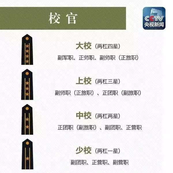两杠带星是校官:从两杠四星到两杠一星分别是大校、上校、中校、少校;