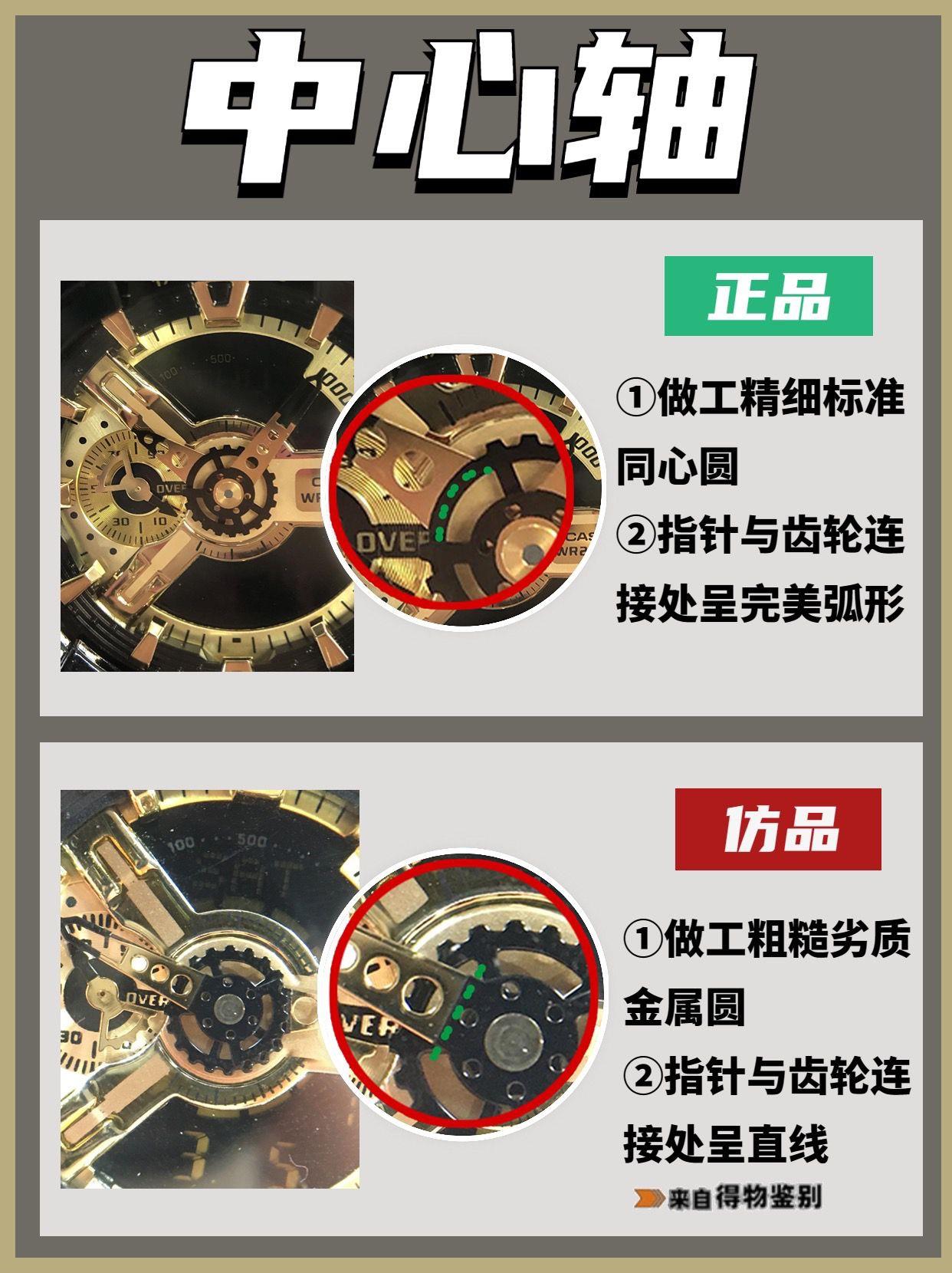 仿品:做工粗糙,是一个劣质金属圆;仿品在指针与齿轮连接处,则是生硬的直线~