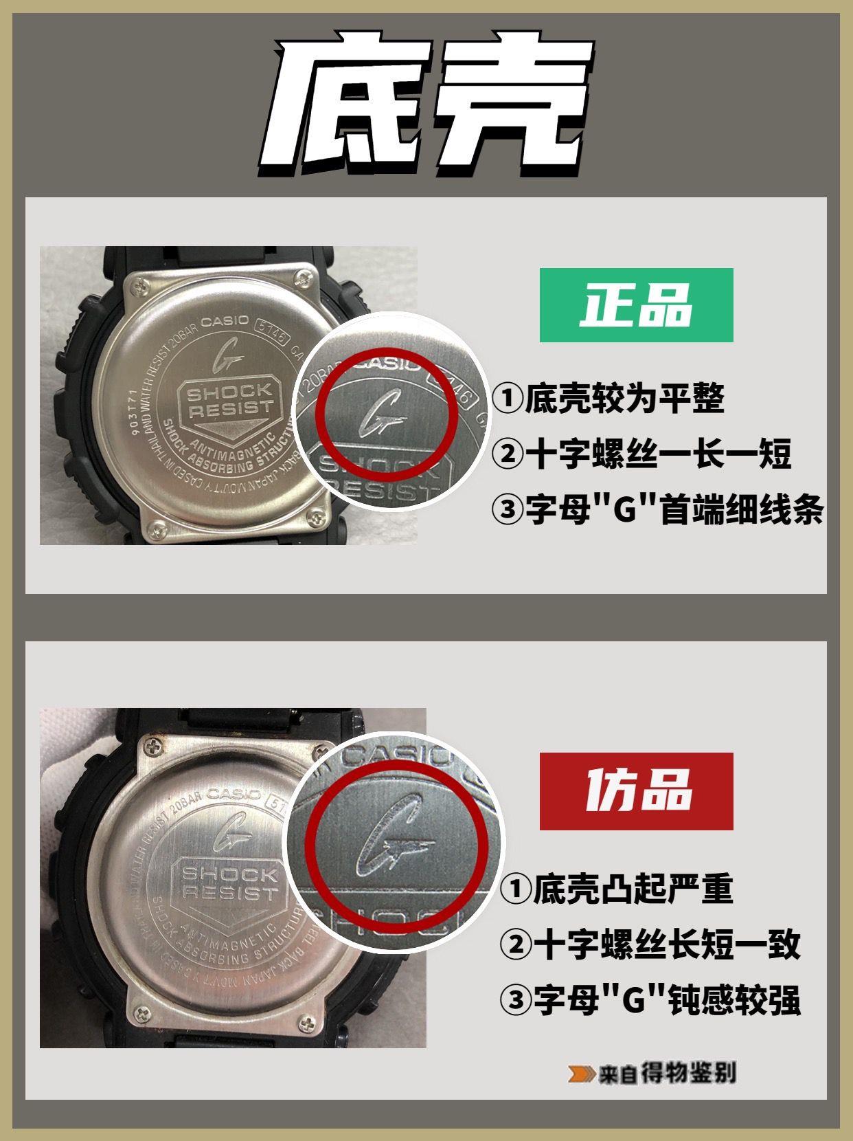 正品:底壳较为平整;十字螺丝一长一短;字母“G”首端cu细线条,像“小刘海”一样~仿品:底壳凸起严重;十字螺丝长短一致;字母“G”则是钝感较强,无“小刘海”~