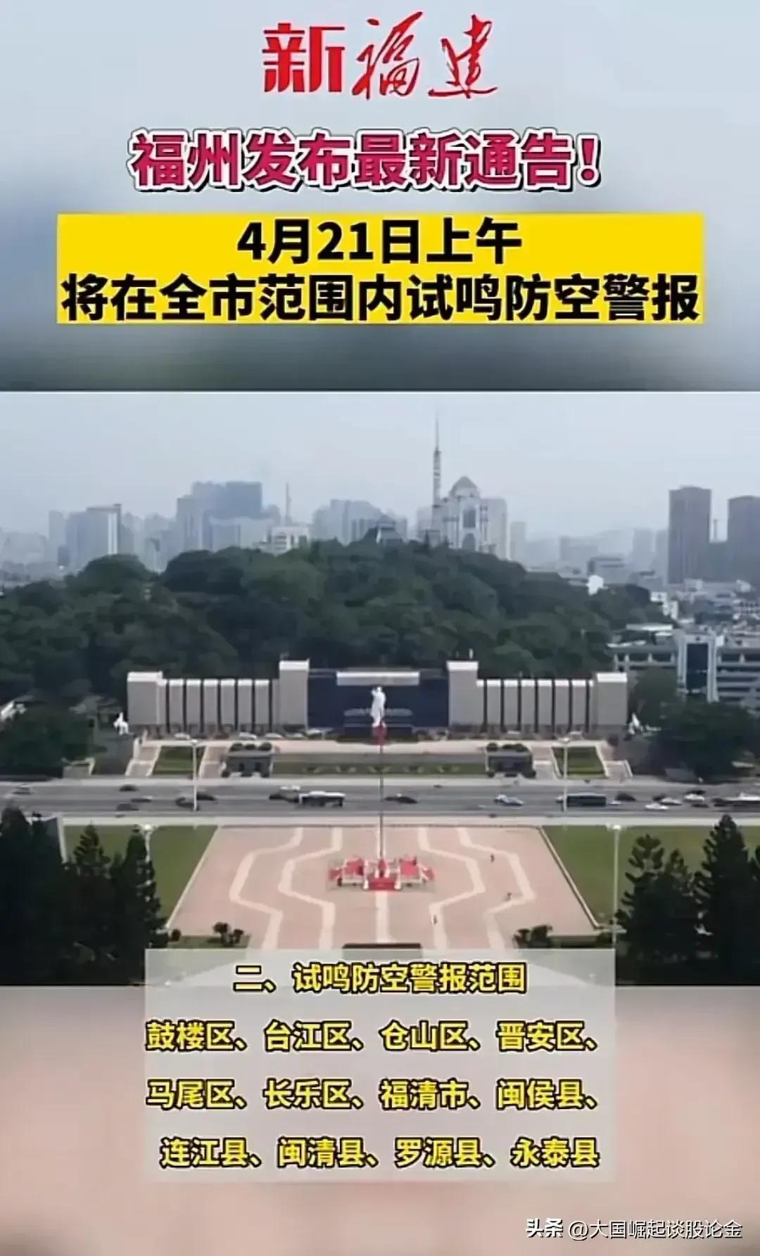 三,福建福州发布公告,将在4月21日全市范围试鸣防空警报。