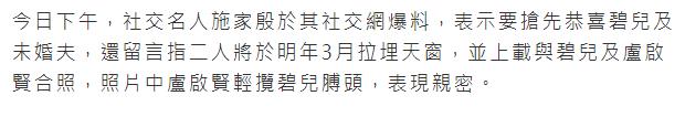 2号下午,施家殷在网上爆料,说要提前恭喜廖碧儿和她的未婚夫,透露了两人将要在2021年3月结婚,同时他晒出了一张合照,为他的爆料增加可信度。