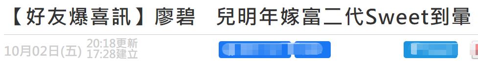 10月2号,有媒体报道,廖碧儿被好友爆料将要结婚了,未婚夫是富二代,更特别的一点,他俩之前就已经分手很久,也没说过复合,竟然突然就要结婚了。