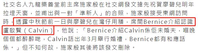 之后有媒体采访施家殷,他说中秋节前一天和廖碧儿一起吃饭,廖碧儿把卢启贤介绍给他,并且称呼卢启贤是未婚夫,整晚聚餐大家都是醉醺醺的,像是庆祝。