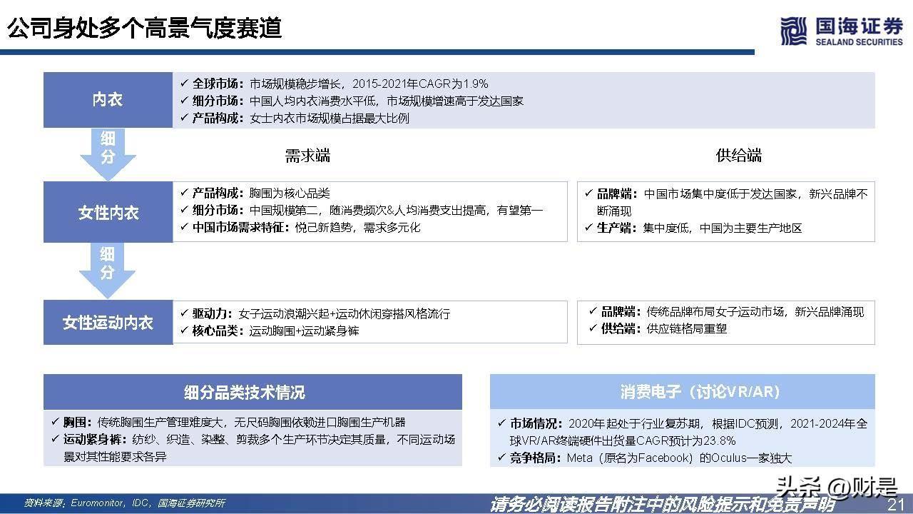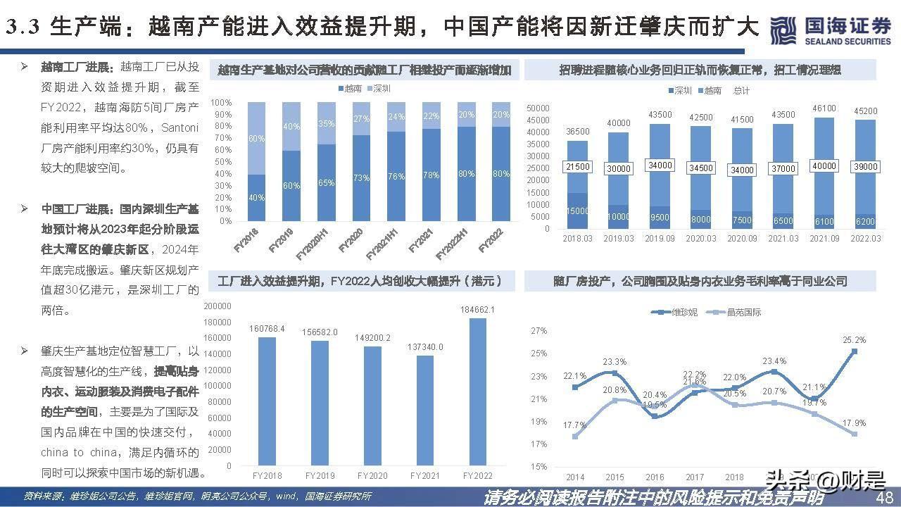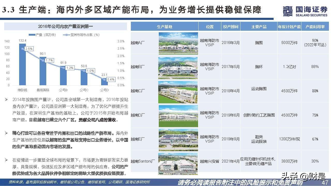 2014年按胸围产量计,公司是全球第一大制造商,2016年按贴 身内衣产量计,公司是亚洲第一大制造商,为了优化产能提升生 产效益,在深圳生产基地的基础上,公司于2015年开始布局越 南产能。目前越南已建立六个厂区,贡献公司八成的营收。精心打造可以各自专注于内需和出口的战略性产能布局。海内外 生产基地的定位是以越南的生产基地支持出口业务增长,以中国 的生产基地推动国内市场的发展。在疫情进一步重塑全球布局的背景下,市场更为青睐研发实力雄 厚、具备规模、快速反应及多区域产能布局的供应商,公司的产 能优势成为各大品牌伙伴争相绑定的稀缺大型优质供应链资源。