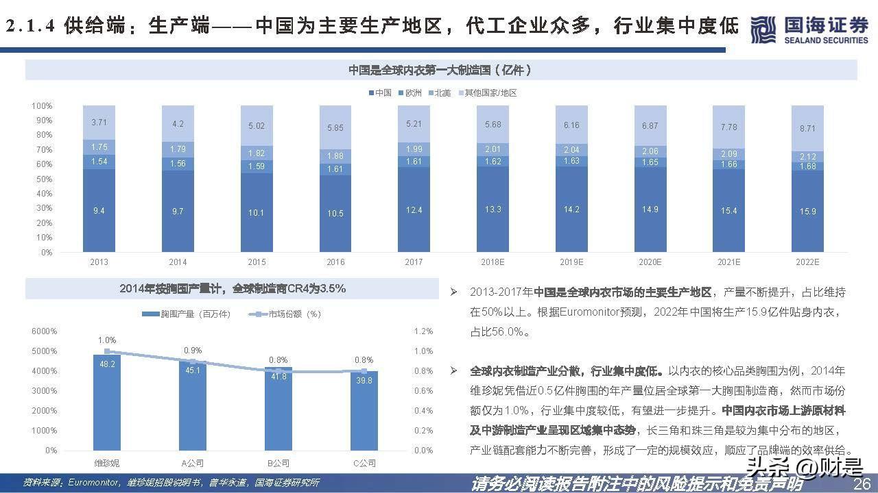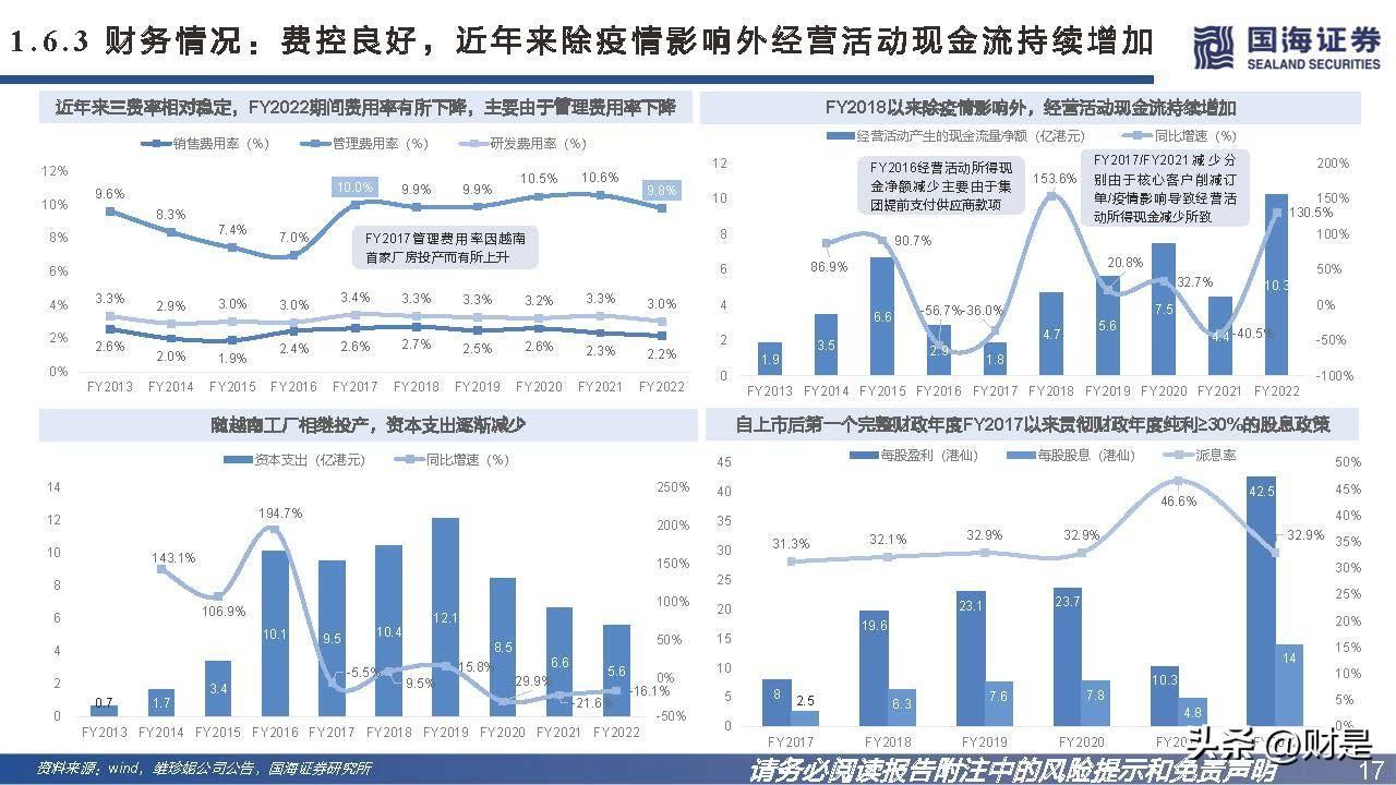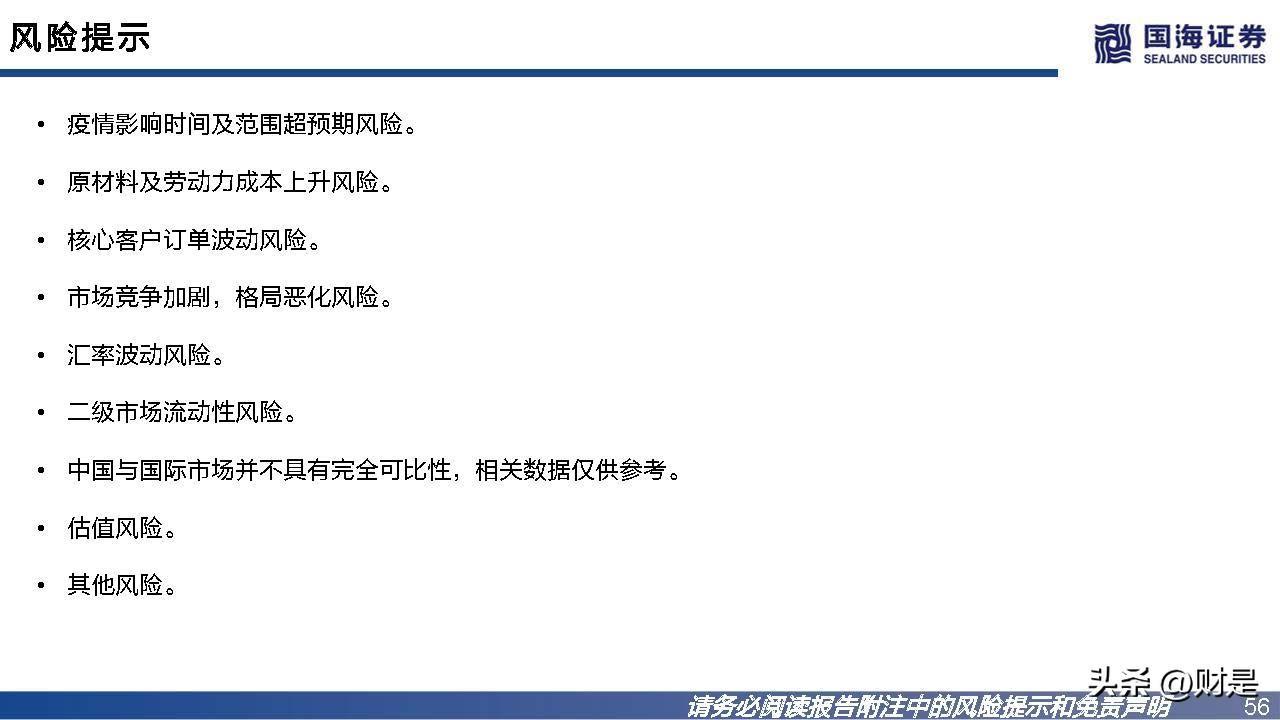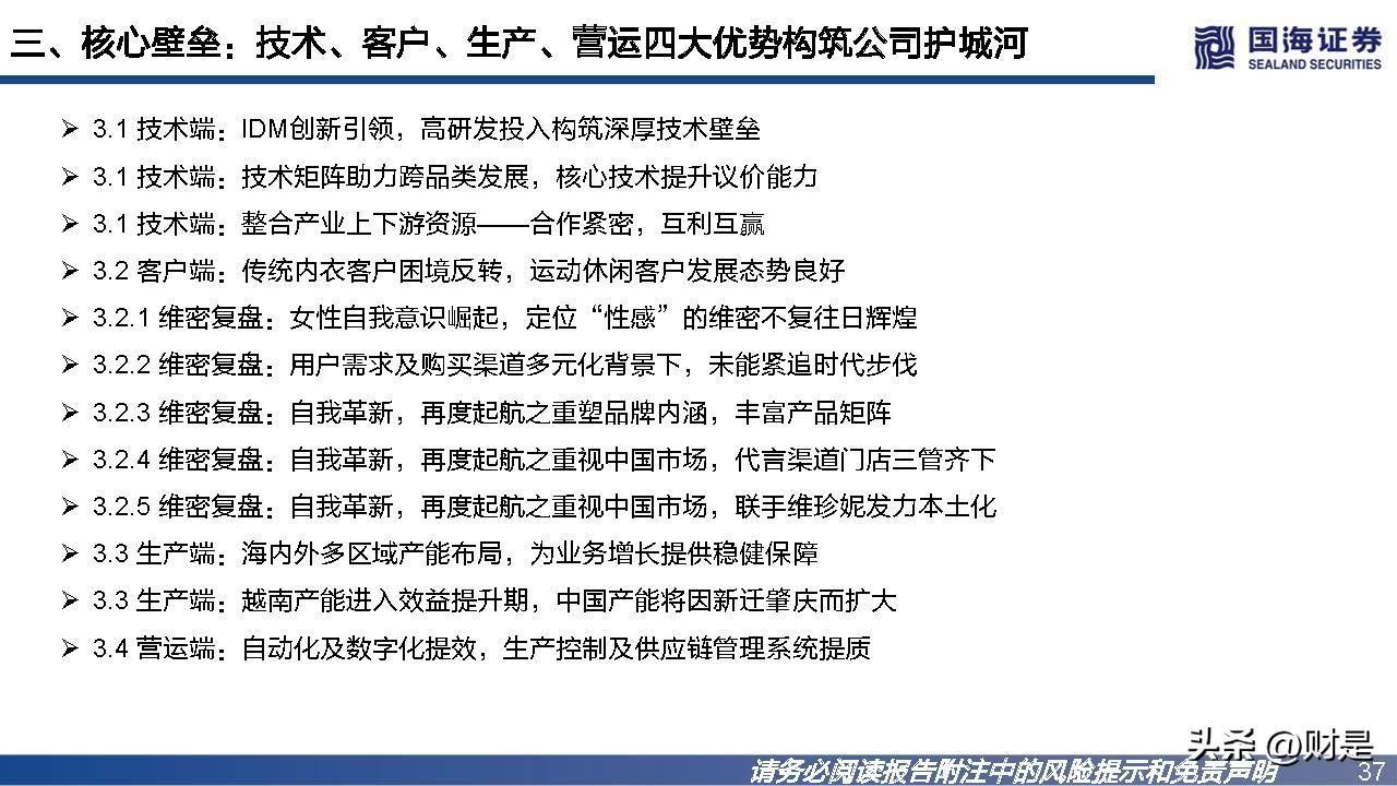 2014年按胸围产量计,公司是全球第一大制造商,2016年按贴 身内衣产量计,公司是亚洲第一大制造商,为了优化产能提升生 产效益,在深圳生产基地的基础上,公司于2015年开始布局越 南产能。目前越南已建立六个厂区,贡献公司八成的营收。精心打造可以各自专注于内需和出口的战略性产能布局。海内外 生产基地的定位是以越南的生产基地支持出口业务增长,以中国 的生产基地推动国内市场的发展。在疫情进一步重塑全球布局的背景下,市场更为青睐研发实力雄 厚、具备规模、快速反应及多区域产能布局的供应商,公司的产 能优势成为各大品牌伙伴争相绑定的稀缺大型优质供应链资源。