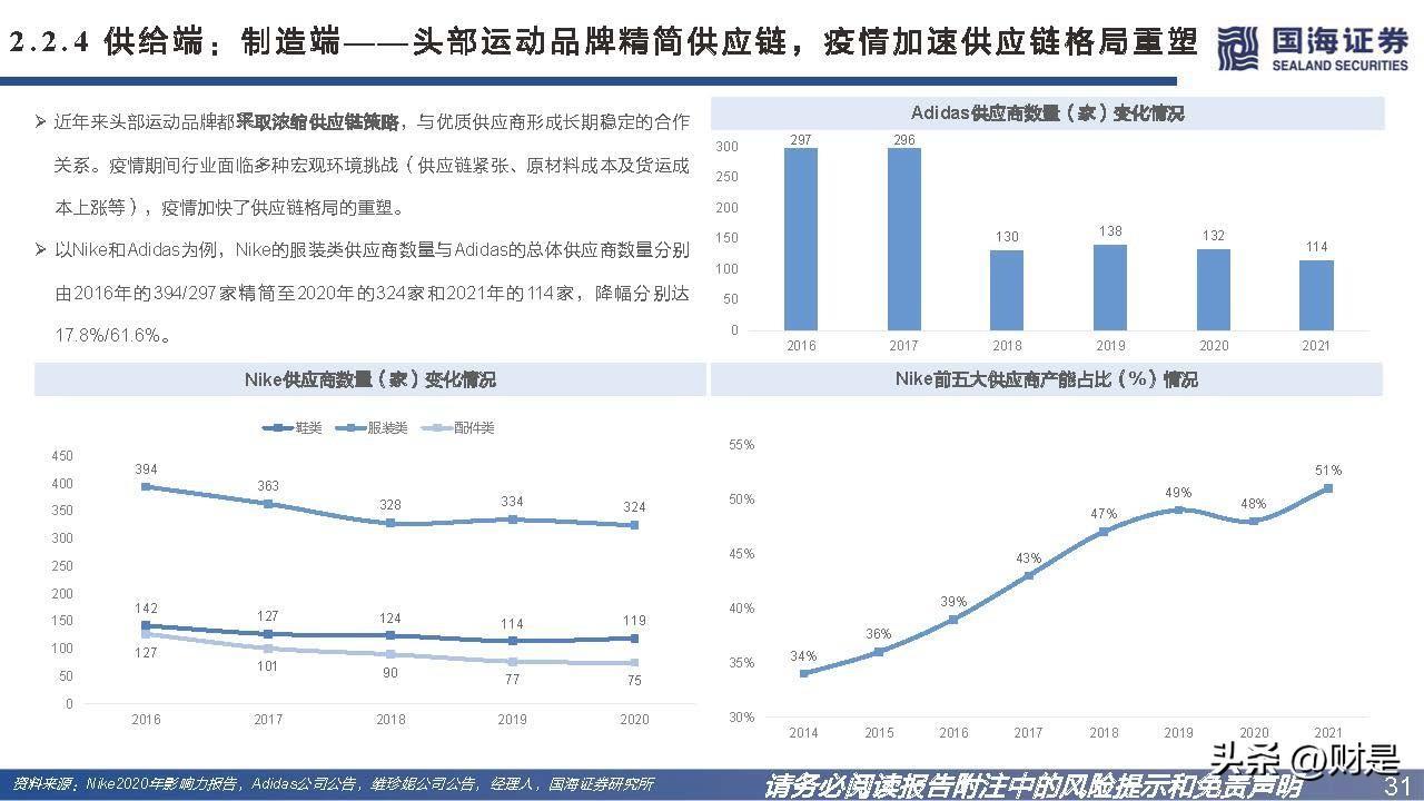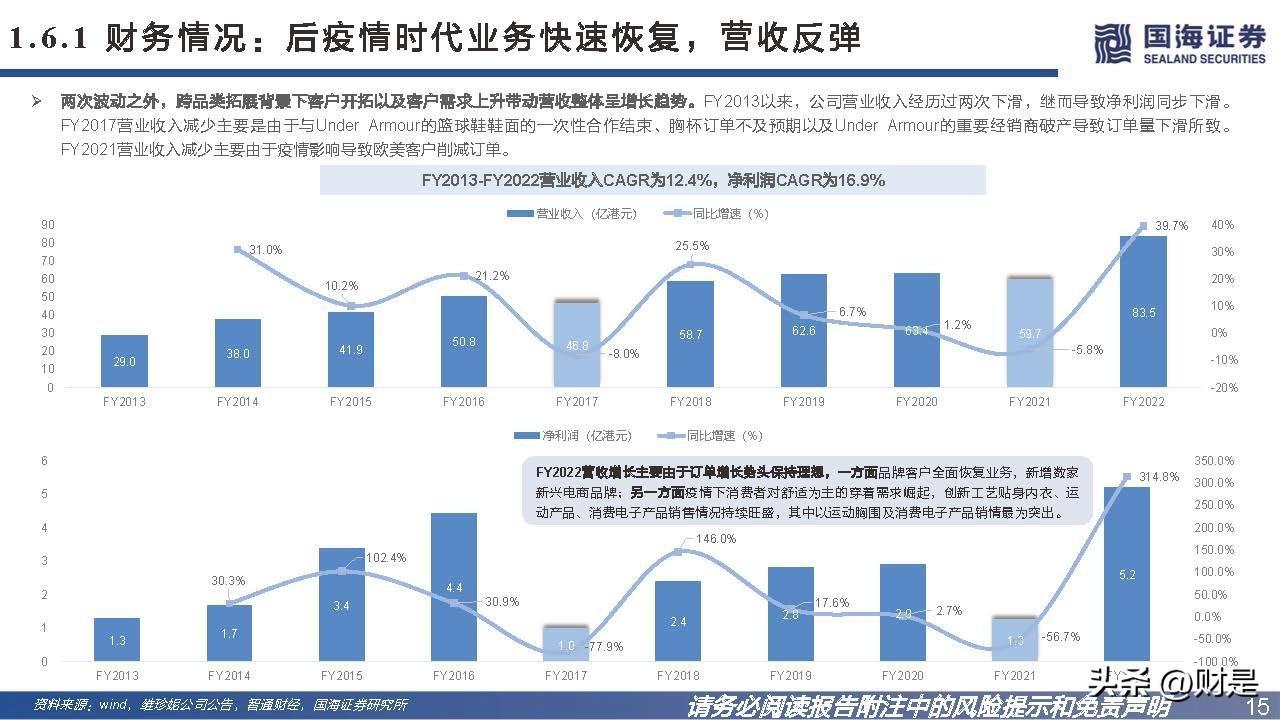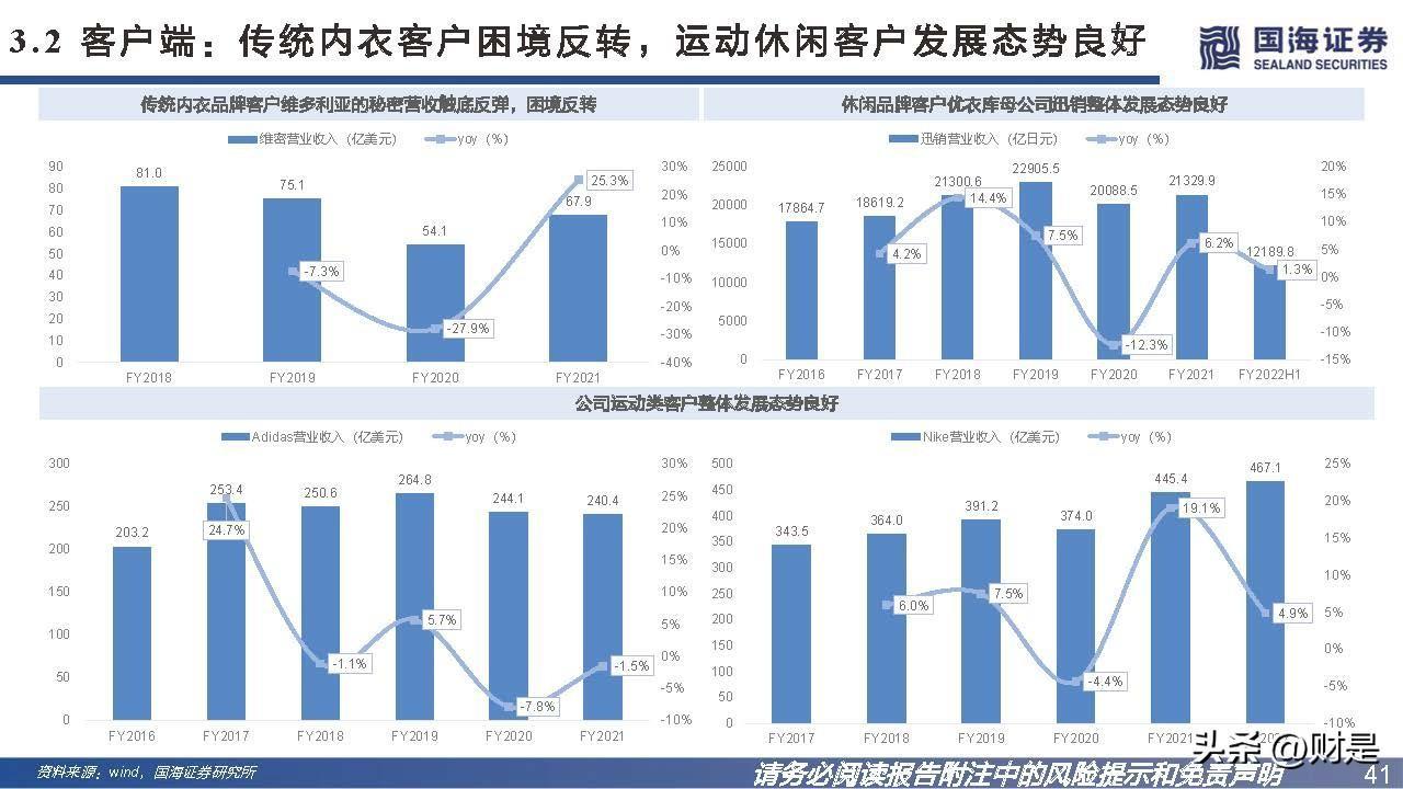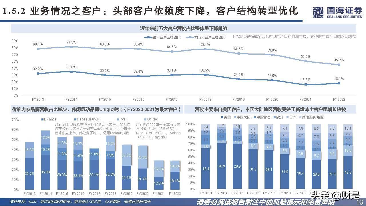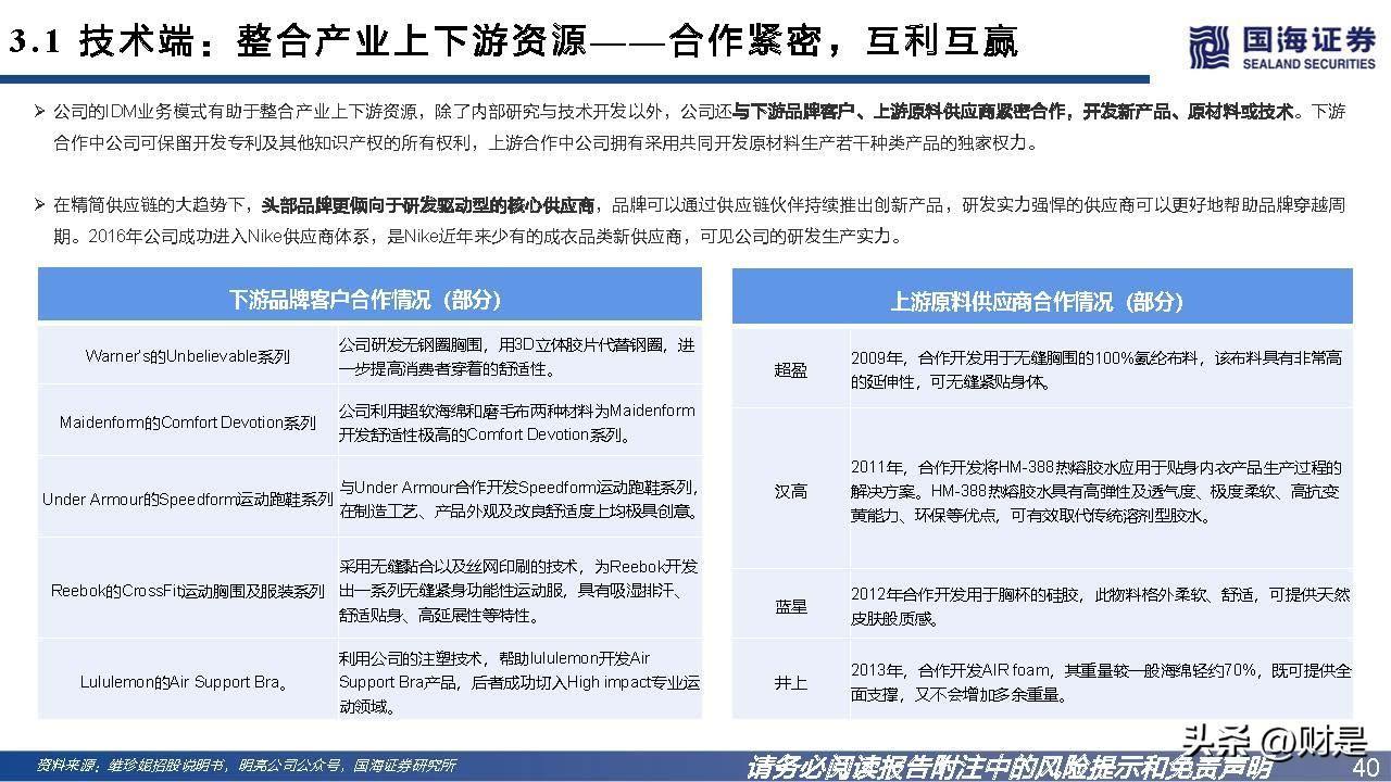 公司的IDM业务模式有助于整合产业上下游资源,除了内部研究与技术开发以外,公司还与下游品牌客户、上游原料供应商紧密合作,开发新产品、原材料或技术。下游 合作中公司可保留开发专利及其他知识产权的所有权利,上游合作中公司拥有采用共同开发原材料生产若干种类产品的独家权力。 在精简供应链的大趋势下,头部品牌更倾向于研发驱动型的核心供应商,品牌可以通过供应链伙伴持续推出创新产品,研发实力强悍的供应商可以更好地帮助品牌穿越周 期。2016年公司成功进入Nike供应商体系,是Nike近年来少有的成衣品类新供应商,可见公司的研发生产实力。