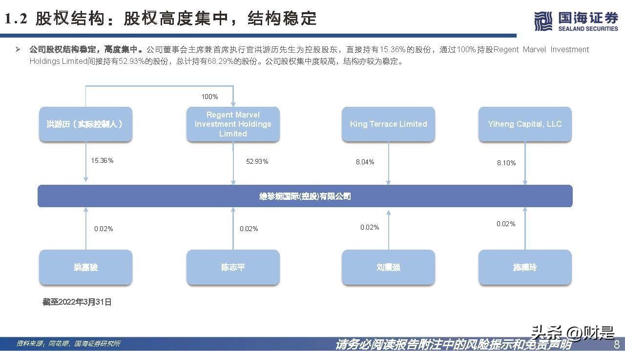 公司股权结构稳定,高度集中。公司董事会主席兼首席执行官洪游历先生为控股股东,直接持有15.36%的股份,通过100%持股Regent Marvel Investment Holdings Limited间接持有52.93%的股份,总计持有68.29%的股份。公司股权集中度较高,结构亦较为稳定。