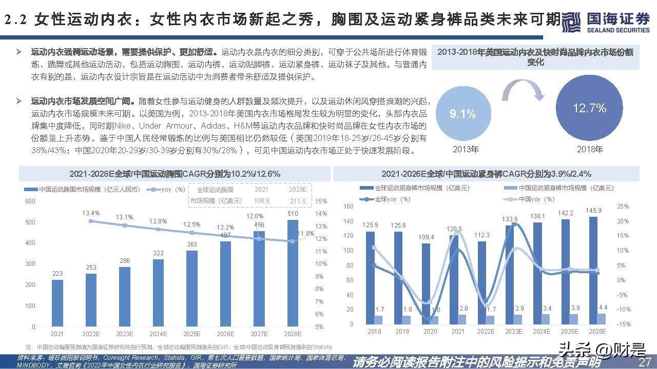 2.2、女性运动内衣:女性内衣市场新起之秀,胸围及运动紧身裤品类未来可期